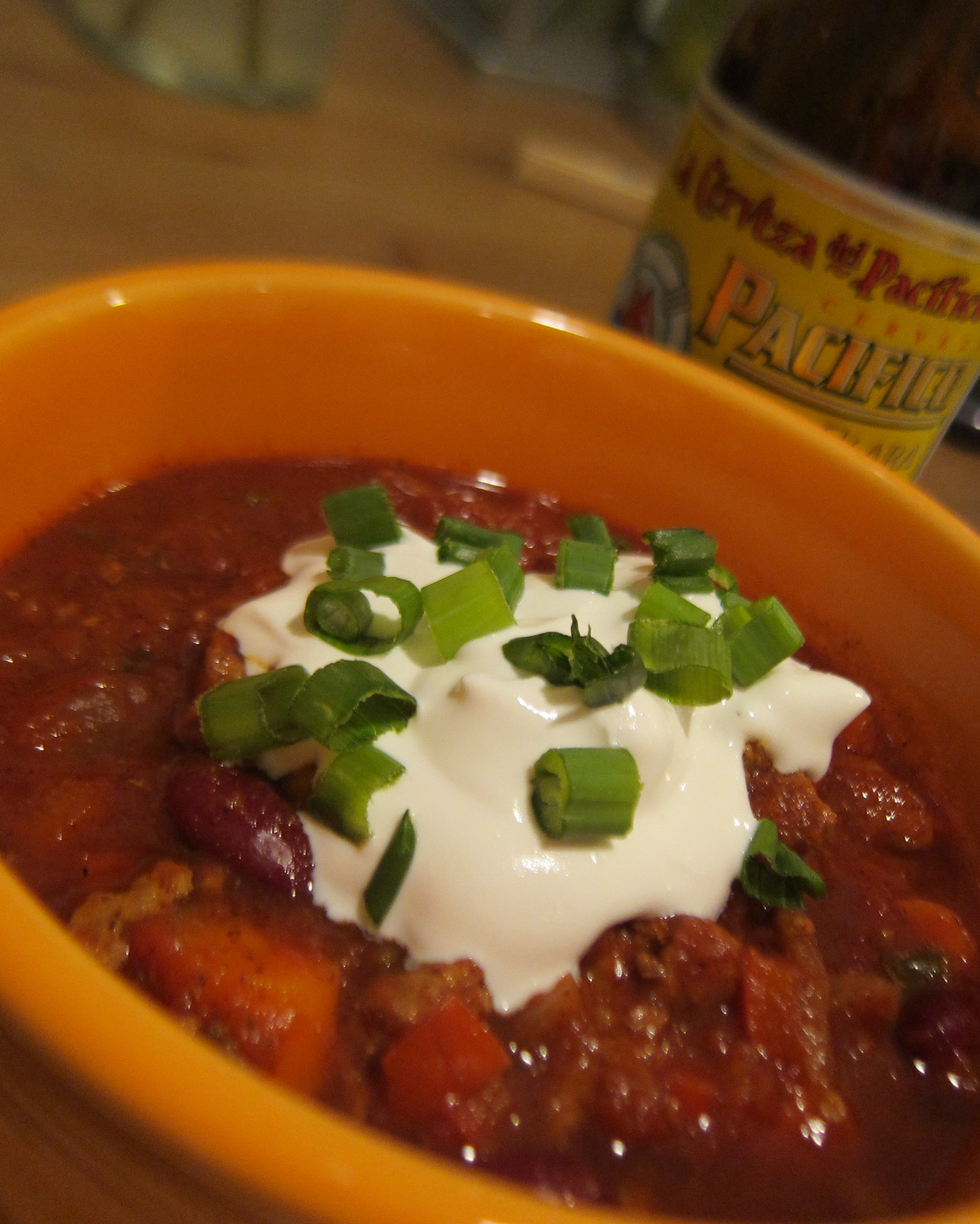 It keeps raining here in Boston which is putting me in the mood for lots of warm things; my Snuggie for kids, slippers from L.L.Bean, and chili! My go-to recipe for chili is this one from Shape.com, but I’ve recently stumbled upon some different kinds made with beer. Yes BEER! Good God why wasn’t I making this before. As luck would have it, I just happened to have a couple Pacífico’s in the fridge. (Thanks to whoever brought that over =) I really liked the taste of beer in the chili. The beer did make it a bit more liquidy so make sure to heat the chili long enough for it to steam off.