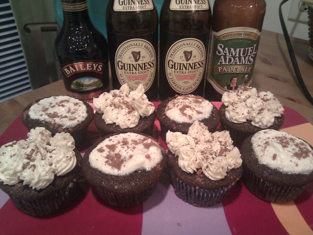 These are some of my favorite cupcakes to make. Top 5 definitely. My buddy G was throwing a farewell party and specifically requested that I bring a batch. How could I refuse! The cakes are modeled after a “Black and Tan”, typically a drink made from a pale ale and a dark stout. Hello Sam Adams and Guinness! Half of them are frosted with an ale glaze and the other half with a Bailey’s buttercream.