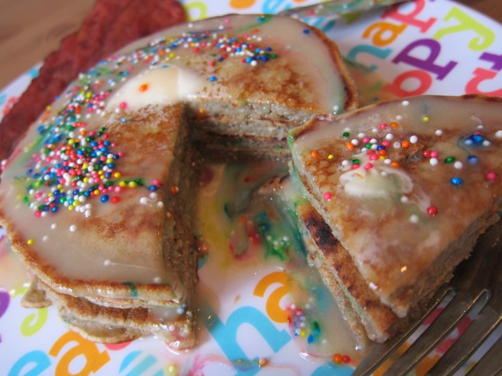 Cake batter pancakes sounded really sweet to me, so I decided to use wheat flour and a different glaze. In my efforts to knock back the sugar a bit, the pancakes didn’t really end up tasting like cake batter haha. They were still good pancakes but next time I’m going all in!