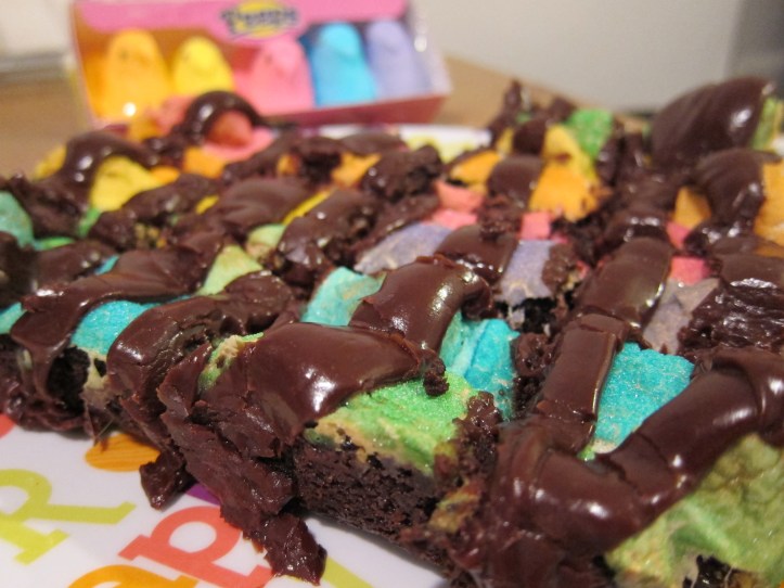 A lot of people hate Peeps. I know a guy who is actually afraid of them! I like Peeps, but prefer mine to be hardened and stale by about 2-3 weeks. The crunch is amazing, try it sometime. It’s weird the things you pick up from your family, thanks Dad! Speaking of which these were adapted from Grandmaman’s cookout brownies. =)