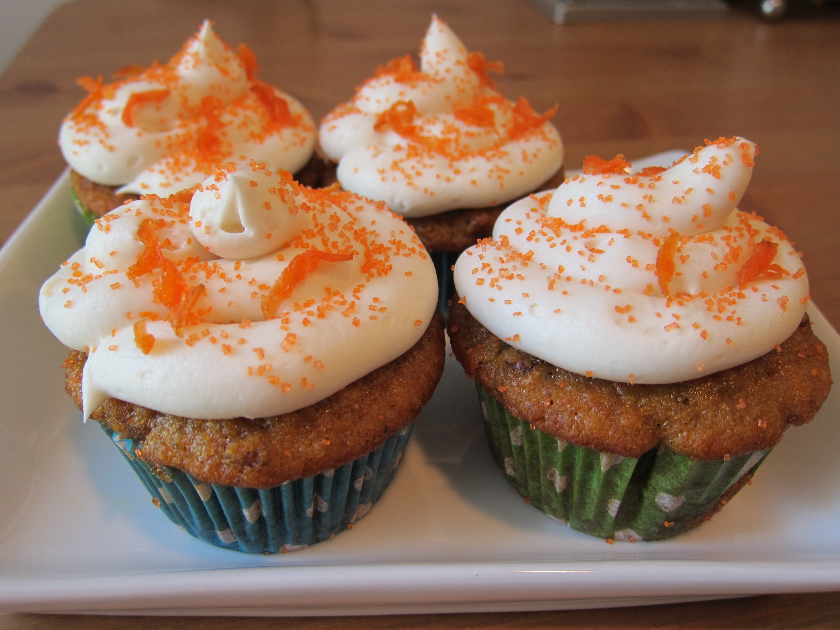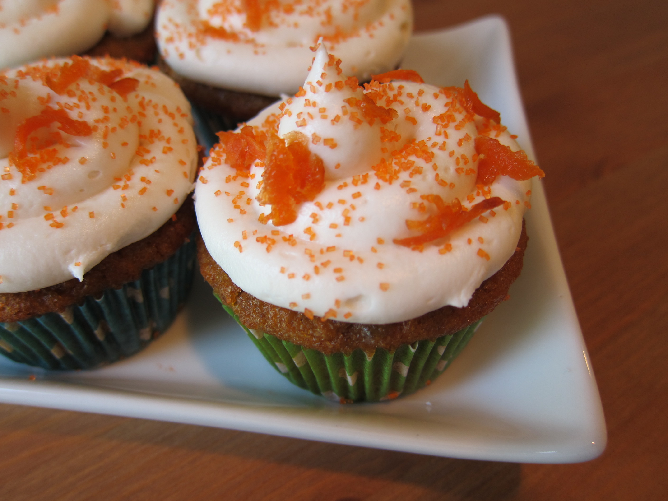 Pipe the frosting in a swirl pattern using a medium circular tip. Then sprinkle on candied carrots!