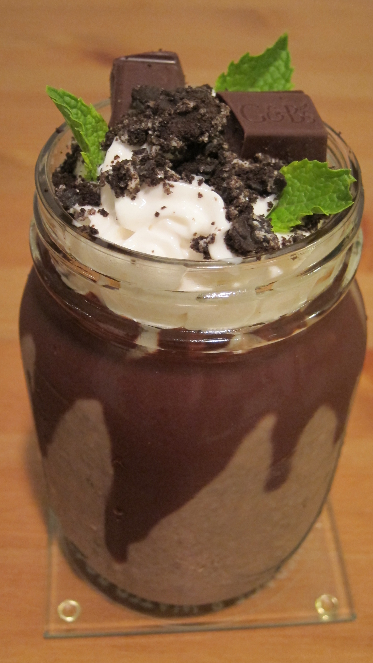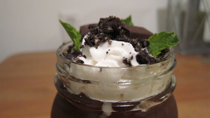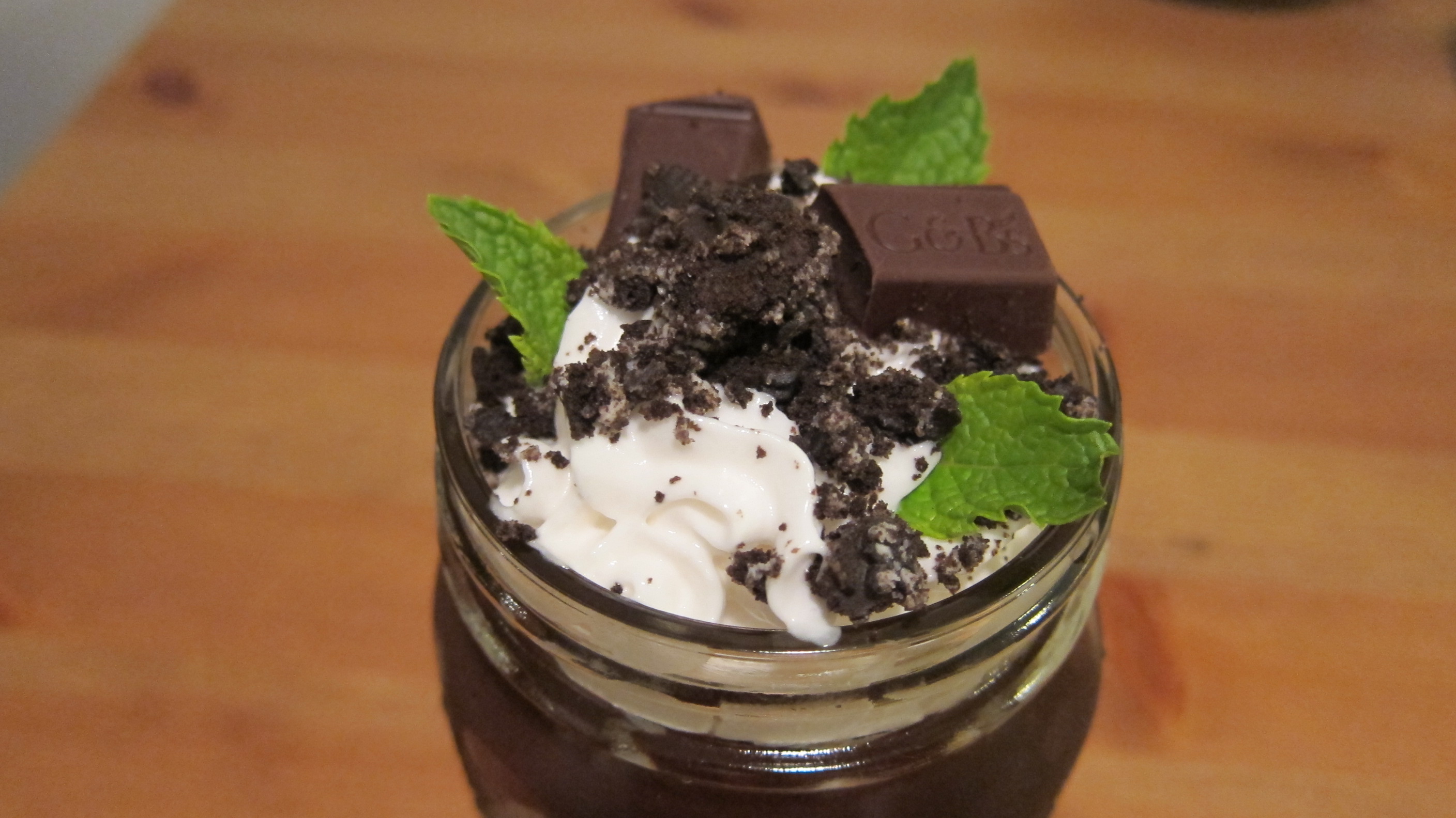Melt the remainder of the chocolate bar in a small glass. Place the frozen desert, milk, and the 5 whole cookies in a blender. Pulse until desert and milk are combined and cookies are in pieces. Drip the melted chocolate along the inner walls of the glasses you’re using. Pour frappe into glasses. Top with Rice Whip and sprinkle on the crushed cookies. Garnish with reserved chocolate and mint leaves.